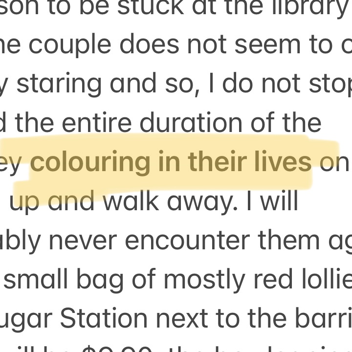 The train is uncharacteristically full of people in non-casual attire this morning. At Balaclava Station, I recognise the voice making announcements is the same bucktoothed woman who has manned the station since I was in high school. She is as enthusiastic as ever in wishing us all a happy Oaks Day. I try and make myself as small as possible as I squeeze into an empty seat among three cramped bodies. The couple sitting opposite me both have glasses hanging over their face and discuss something quietly under a shared breath. The way the couple both lean in and hold one another up makes me feel good about this train and the city it is moving through. It occurs to me that The Man is presently waking up in Bologna with nothing on his plate except to eat lunch and then dinner. When I get stuck on the disparity of our situations, I remind myself this is the second last Saturday I will spend at the library for a long time, and I ought to be grateful I have a reason to be stuck at the library at all. The couple does not seem to care for my staring and so, I do not stop. I spend the entire duration of the journey colouring in their lives only to stand up and walk away, acknowledging I will probably never encounter them again. I fill a small bag of mostly red lollies at the Sugar Station next to the barriers. That will be $9.90, the boy leaning on the counter says. I look to the scale in disbelief, then to the boy. He shrugs. You like the heavy ones, he says.