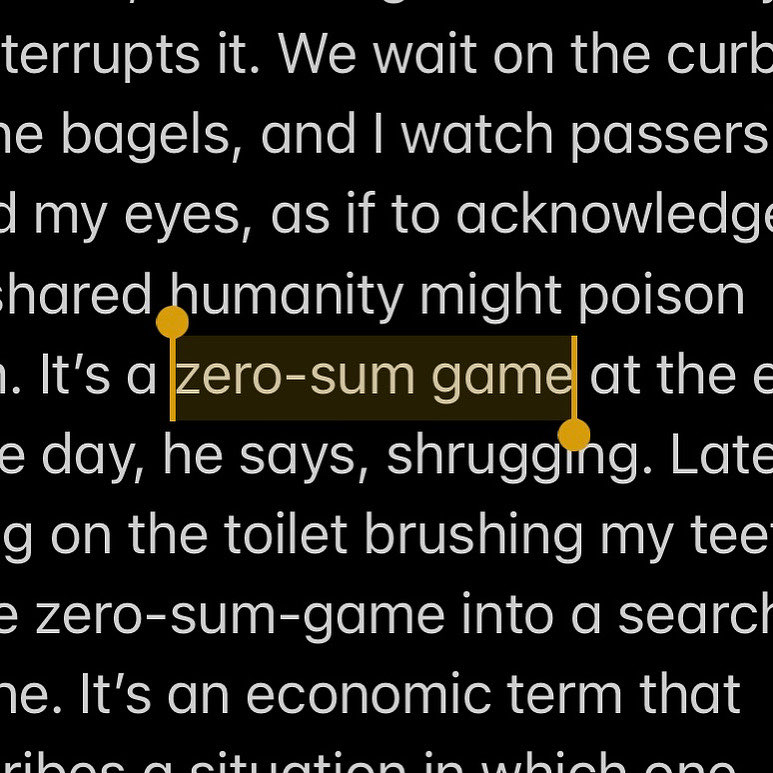 It is a Monday, our last off together before commencing study and work, so The Man and I make our way across town for a highly anticipated bagel. We are in his Dad’s Saab, the roof above us a light blue lid of sky, which makes me feel like we are on holiday all over again. Is it that the city has changed, or we have come home different, I say staring out at the suburban sprawl. I order the bagels how we like them via the app designed by the bagel shop for the sole purpose of ordering bagels, which are more expensive now. I don’t think it’s that we are that different but that we have afforded ourselves a circuit breaker and so now we see it from a different angle for how it really is and has always been. I consider our angles, respectively, and recognise that while similar they are fundamentally different. This is just how it is. How it will always be, no matter how much distance we attempt to close between us. When I let myself go to this place, I feel both lonely and claustrophobic at once. In our year away, The Man must have learnt to recognise when I am walking down this path in my mind. Maybe it gets caught on my face, or in the set of my shoulders, but I am glad for the way he interrupts it. We wait on the curb for the bagels, and I watch passersby avoid my eyes, as if to acknowledge our shared humanity might poison them. It’s a zero-sum game at the end of the day, he says, shrugging. Later, sitting on the toilet brushing my teeth, I type zero-sum-game into a search engine. It’s an economic term that describes a situation in which one person or group can win something only by causing another person or group to lose it. I think of the word hostility at this moment, and the feeling of the wine shop, and the young woman, about my age, at the lights today who did not have room for my existence. ‘It’s your being cool affects my being cool’, The Man declared this morning with cream cheese all over his face.